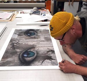 Paul now works on “slightly” larger canvases with a backlog of commissions for his infamous “eye” pieces (after listening to these podcasts we’re pretty certain you’ll see these in a new light).